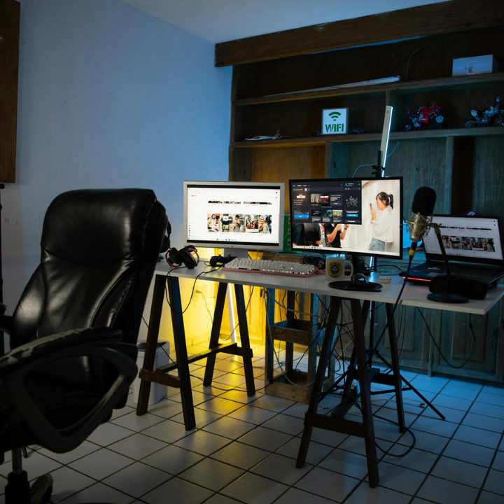 Computers, monitors, keyboards, webcams.